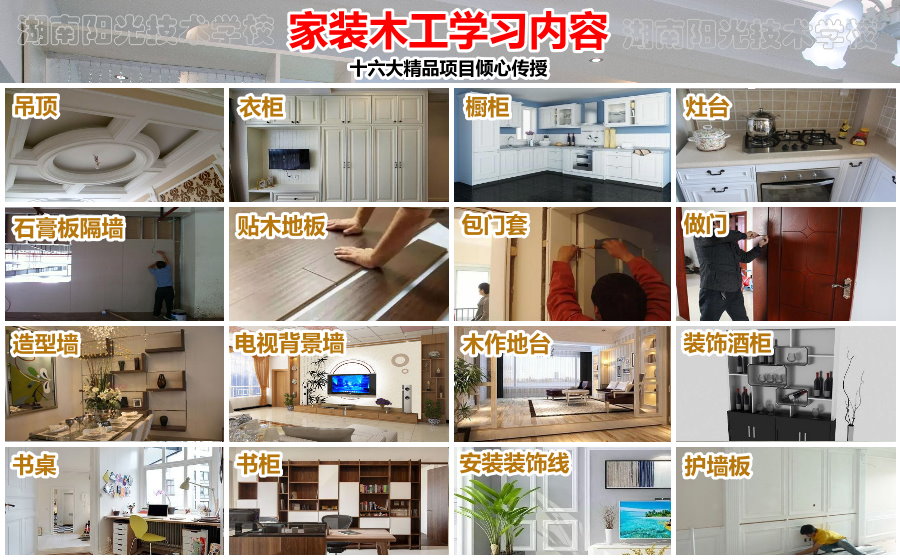 9,重点学习:吊顶、衣柜、橱柜、灶台、石膏板隔墙、贴木地板、**门头、**门套(**括做门)、窗帘盒制作安装、造型墙、电视装饰背景制作、木作地台、装饰酒柜、书桌、书柜、安装木质装饰线、护墙板等十六种家装木工技术。